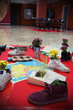 Mapping the Terrain propone un recorrido por un espacio de formas y objetos simbólicos para canalizar ideas, pensamientos, fantasias, posibilidades y anhelos. No se trata de escenarios para ser vistos, sino para ser experimentados, para tocar, que invitan, en definitiva, a participar. En un medido juego entre equilibrio y desequilibrio, la intervención se articula simultáneamente de distintos niveles de sentido y significación. Una metáfora utópica en torno a la fomación didáctica, el valor de la creatividad, la cosecha, la recogida de frutos y los cimientos.